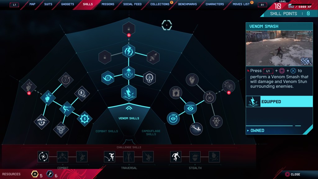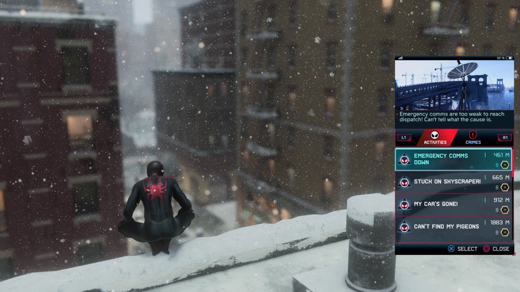 Miles Morales’ User Interface and Experience also get some additions and refinements. The skill tree is rebuilt and much easier to navigate and understand. This comes along with Miles Morales having more abilities than Peter Parker in the 2018 installment in the franchise. So, this refinement was extremely necessary with an increase in abilities. Also, there is a new phone app (screenshot above), it is simple and clean, and the tabs are descriptive, and each activity or crime shows its distance from the player. As someone who has tried to create a phone app in a small group indie game before it is not as easy as it seems!