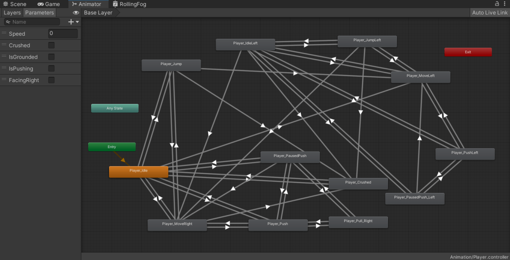 Creating the logic and spider-web of connectors to switch between our animations was a great learning experience and required a lot of testing to confirm that the logic worked out.